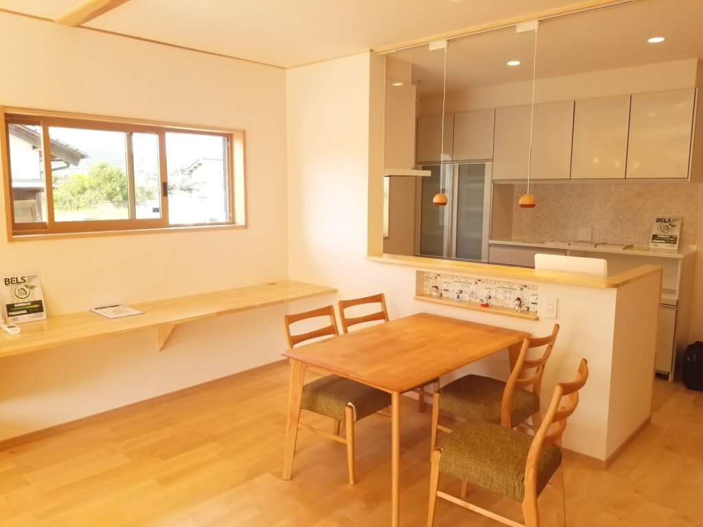 こちら、間仕切り無しのすごく広いリビングがあります(^^)/広さは約22帖!テレビ裏の杉板の壁や造作カウンターなど、全体的に木の色が出ておりますね!これだけ広いとエアコン1台で大丈夫なのか・・・大丈夫なんです(*‘∀‘)さすがはゼロエネルギー住宅。(詳しい性能を話すと長くなってしまうのでまたの機会に・・・(^^;)ちょっと入らせてもらったのですが、とても快適でした。