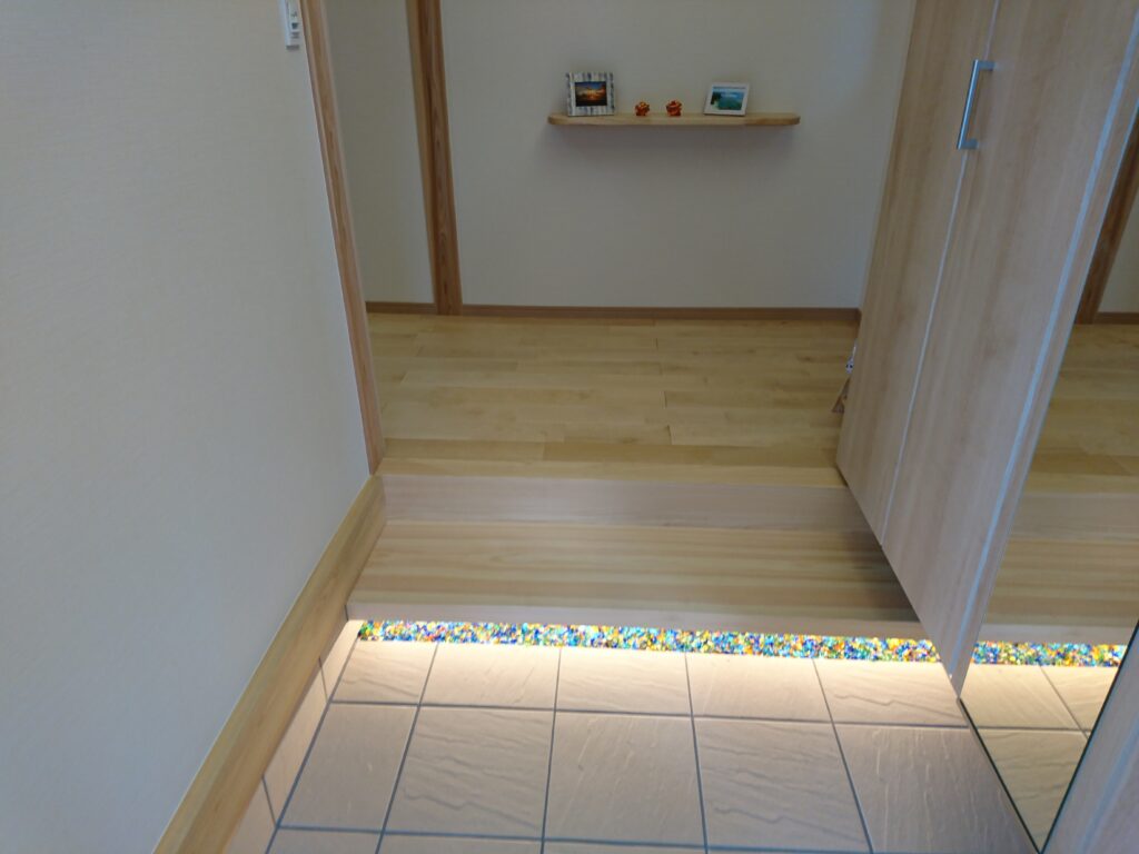 玄関敷台の下には琉球ガラスが敷き詰められております。間接照明のぼんやりとした感じもなかなかいいですね。