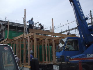 土台据え終え、外部先行足場を施し、いよいよ建前です。