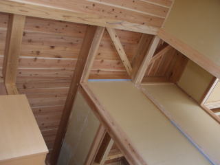 梁も綺麗に納まり、杉板の天井板,床板と相まって非常に感じ良く仕上がっていますね。