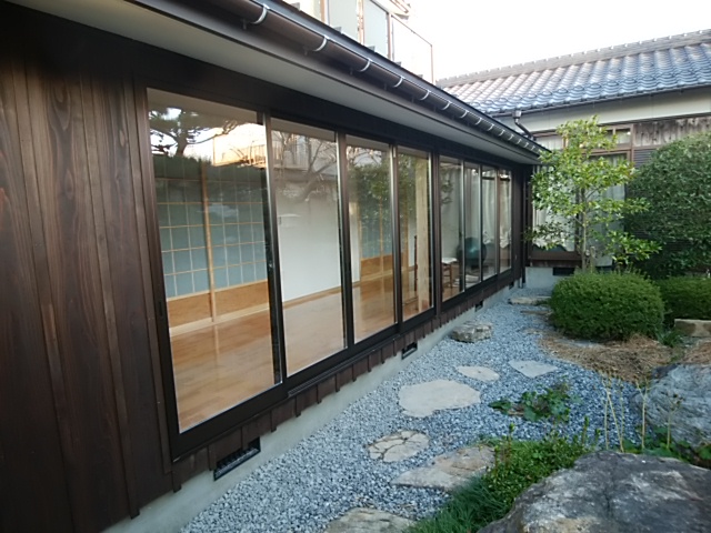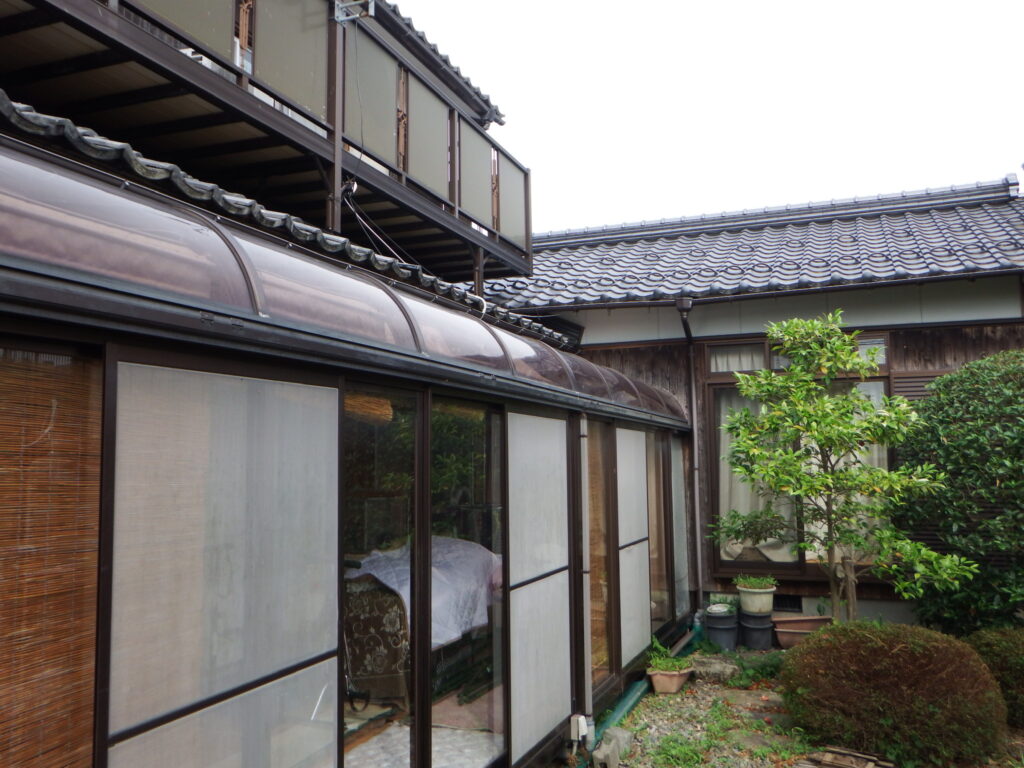 こちらは既存のサンルームになります。こちらを解体し、下屋を新しく増築していきます。立派な庭がありますので、外観を損ねないようにしなければ(;・∀・)