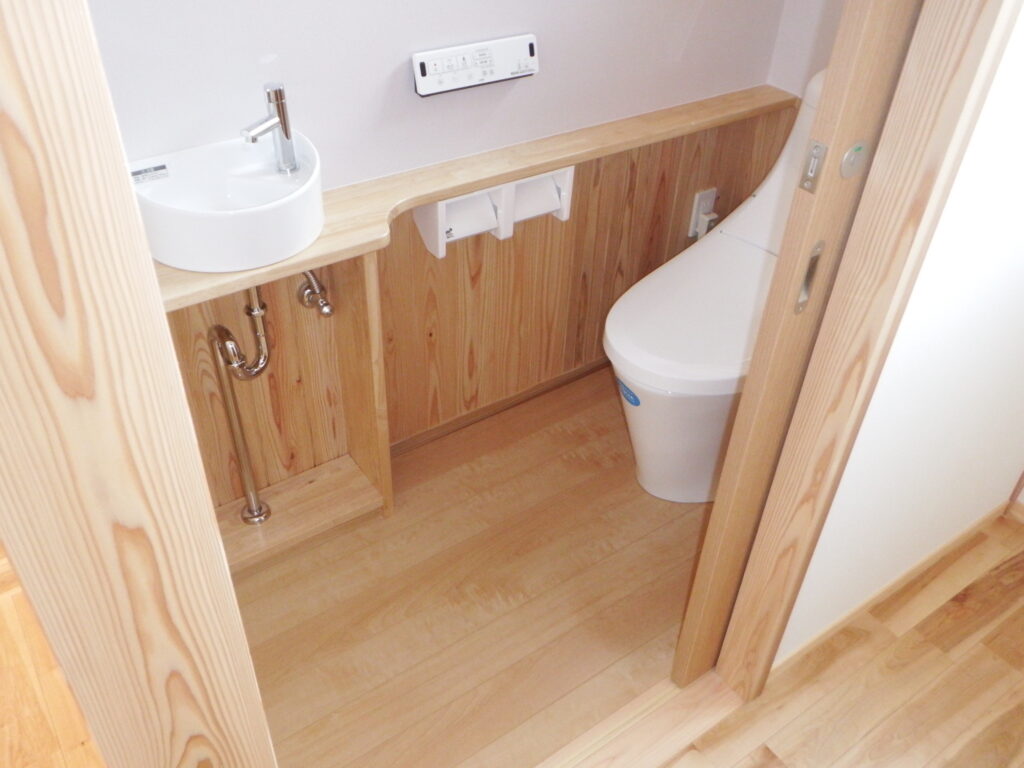 トイレも一枚アップします。杉の腰板は湿気を吸収してくれるので水回りには最適です。