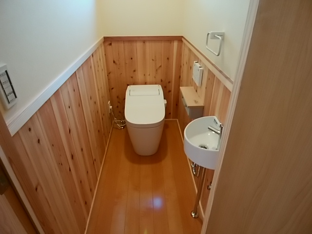 続きましてトイレです。腰板は杉材を使用しておりますので、いい香りがします。湿気も吸収してくれますので水廻りには最適ですね。