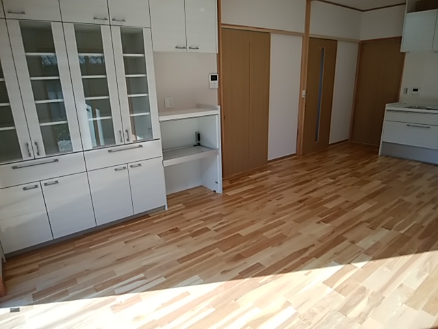 別の角度から。カップボードも備え付けてあり、収納はばっちりです。さあ続いて和室を紹介します。