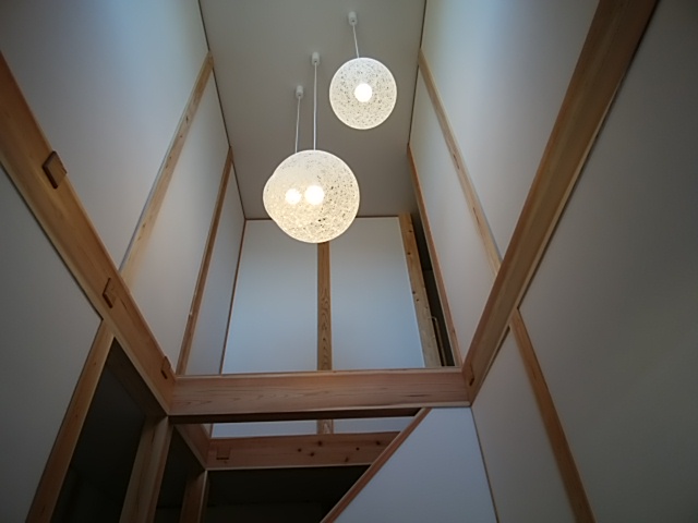 まずは玄関の吹き抜けですね。照明器具がオシャレです(^^)/上部には採光窓がありますので、とても明るいです。