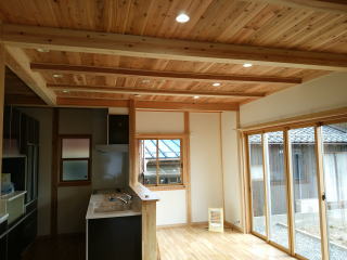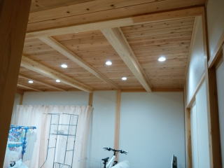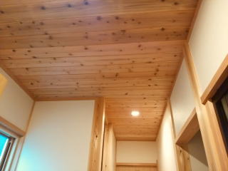 居間の天井及び玄関の天井にも杉板が貼られています。