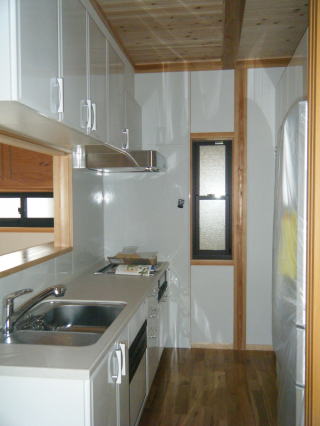 キッチンにも急な来客の時の為に、目隠しの3枚吊り戸を設置。