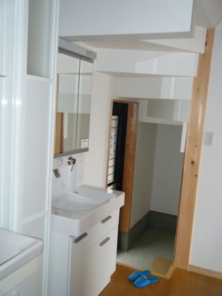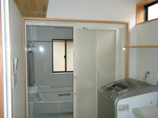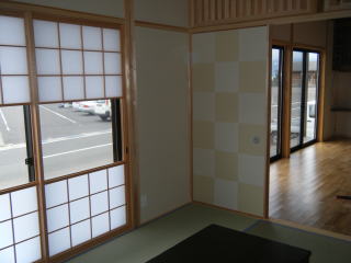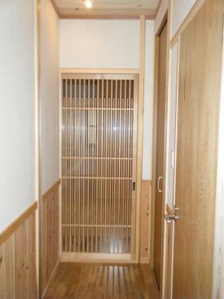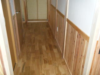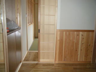 右の写真は居間から玄関を見たところで、床がナラ,腰板天井板は杉,クロスは天然素材の物です。