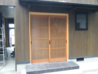 玄関入って正面が和室の入口。その入口にも杉の舞良戸を建てました。