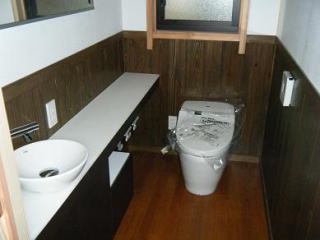 トイレをダーク調の色調で仕上、カウンターも設置し洒落た店舗のトイレのようです。