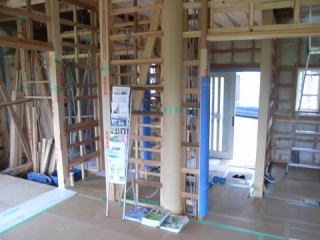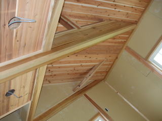 内装工事を施工中。ご覧の通り梁も現し天井も杉板です。