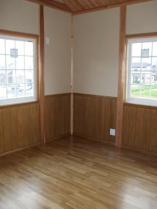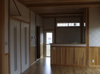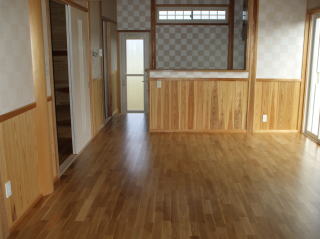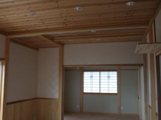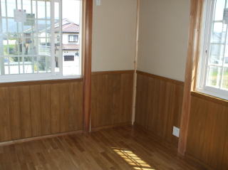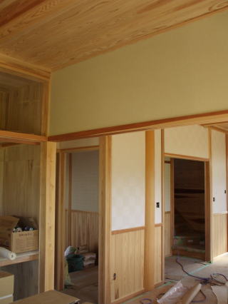 床はナラの無垢材、腰板及び天井は杉の無垢板、壁紙は天然素材の物です。