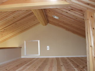 梁を化粧で表し、天井床に杉板が貼ってあるため、まるでログハウスみたいですね。