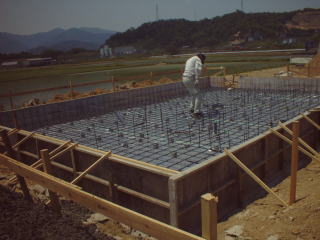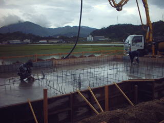 基礎工事です。砕石を敷き天圧し、鉄筋を組コンクリートを打ちます。