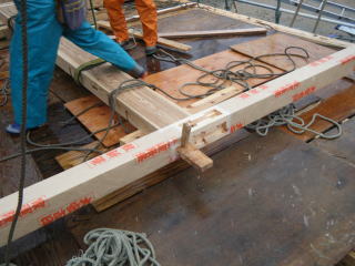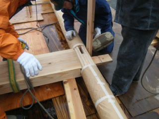 建前の最中です。ご覧の通りこのお家の梁の仕口は、ボルトを使わない伝統工法で加工しています。