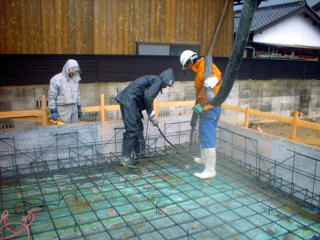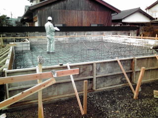 基礎工事で、左が配筋検査,右がベースコンクリートの打設です。
