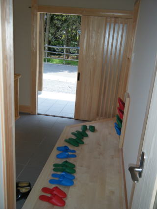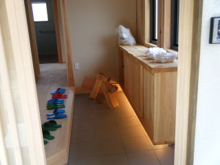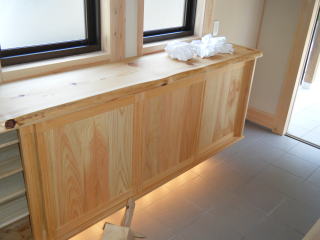 玄関戸も桧で作り、下駄箱も桧の無垢材で作りつけ!