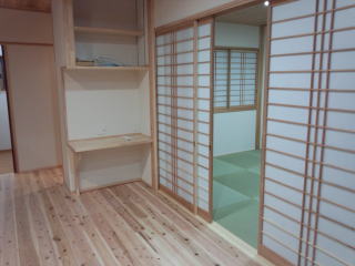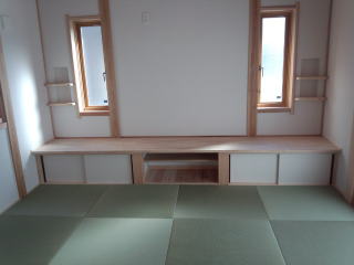 右は和室で、造り付けのテレビ台。畳もヘリ無し畳を使用してます。