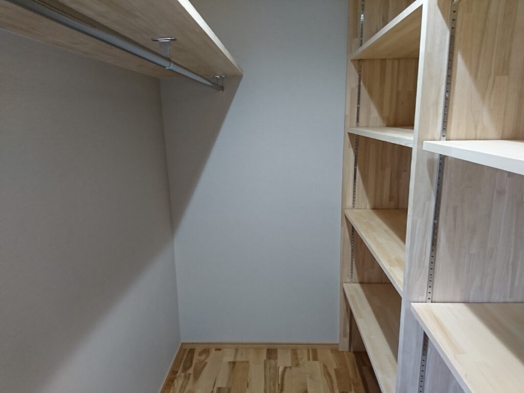 8帖の寝室。WIC(ウォークインクローゼット)も併設されております。写真では収めておりませんが、2階廊下には、クローゼットも設置されており、今回も収納たっぷりの木の家になっております。